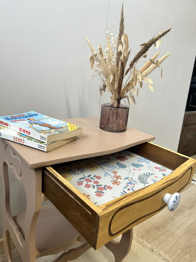 L'intérieur du tiroir est recouvert d'un adhésif fleuri qui s'accorde avec le bouton bleu.