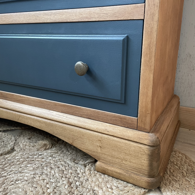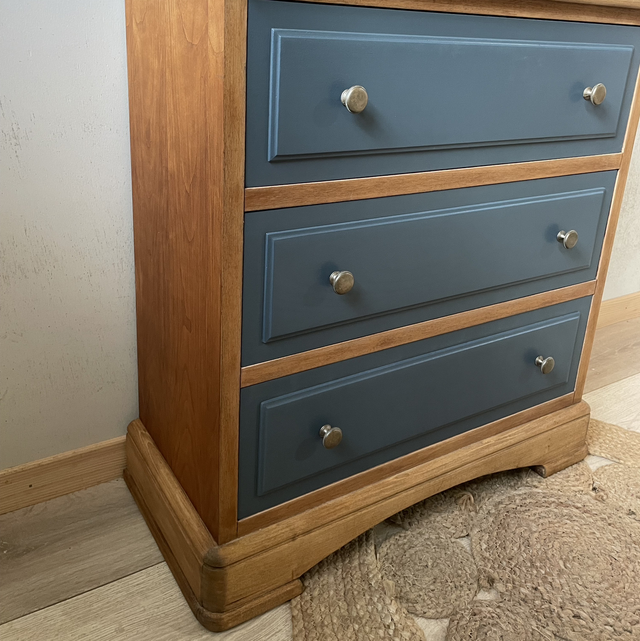 Apportez du cachet à votre intérieur avec cette élégante commode en bois aux tiroirs bleu profond. Son alliance chaleureuse du bois naturel et de la couleur moderne lui donne un style à la fois authentique et actuel.
