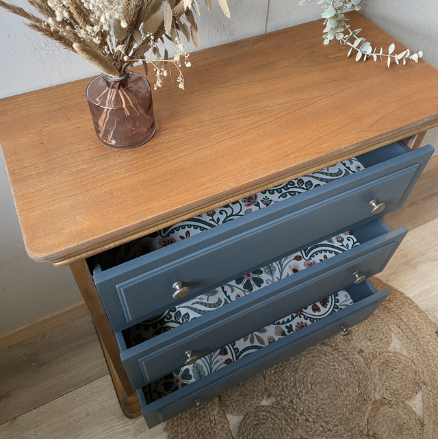 Dotée de 3 tiroirs avec jolis boutons métalliques et un intérieur tapissé fleuri (l’un des tiroirs est plus court en profondeur car il s’agissait d’un meuble tv), elle offre une belle capacité de rangement tout en restant très déco.