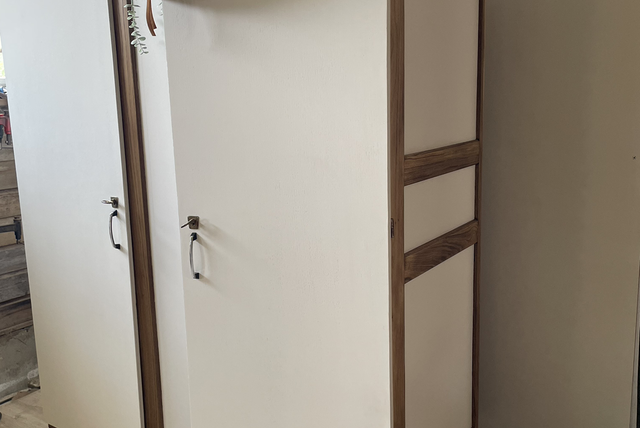 L’armoire a été poncée, protégée par un vernis incolore mat.